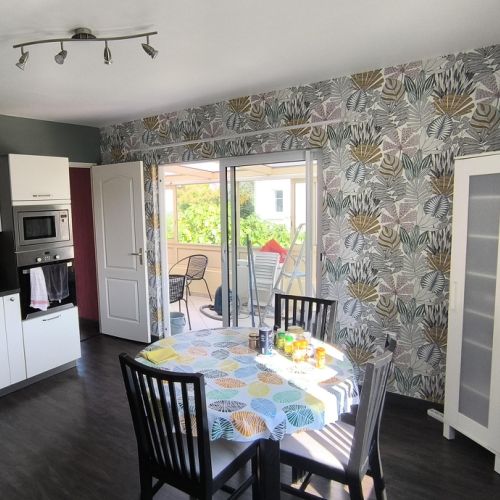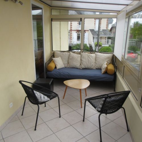 L'appartement en location est au premier étage de la Villa Caprice avec un accès indépendant, cour et terrasse privative et se compose d'une véranda, d'un séjour-cuisine (baie coulissante entre la véranda et le séjour-cuisine).