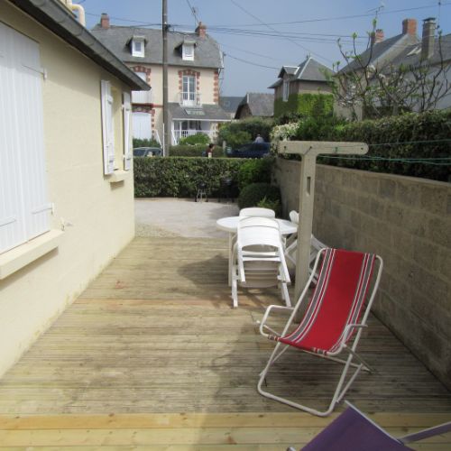En rez de chaussée,une cour et une terrasse bois avec salon de jardin , transat et barbecue .